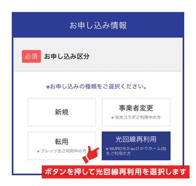 こちらのページから「 Web申し込みフォーム 」光回線再利用にてソフトバンク光をお申し込みいただけます。