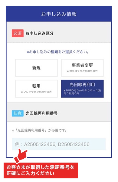 お客さまが取得された光回線再利用承諾番号の入力方法についてご案内いたします。